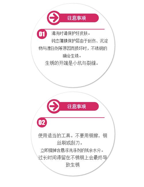 但是清洗不銹鋼表面的時候要注意:不銹鋼表面不能發(fā)生刮劃現(xiàn)象;不可使用含有漂白成分以及研磨劑的洗滌液,如果使用了洗滌液,必須在結(jié)束后使用干凈的水沖洗干凈。